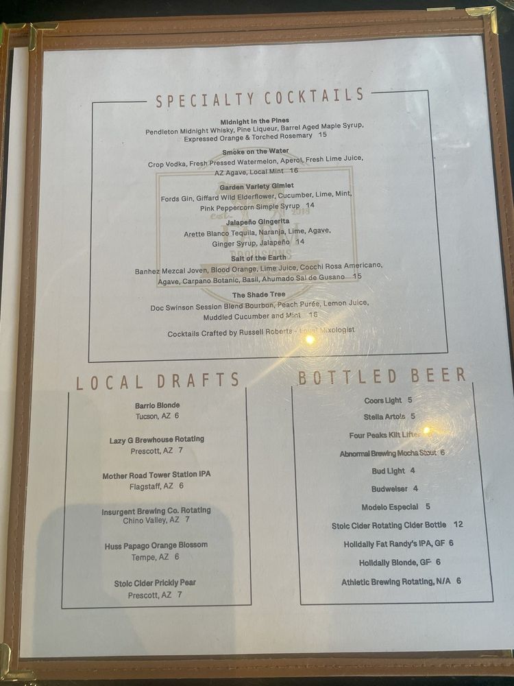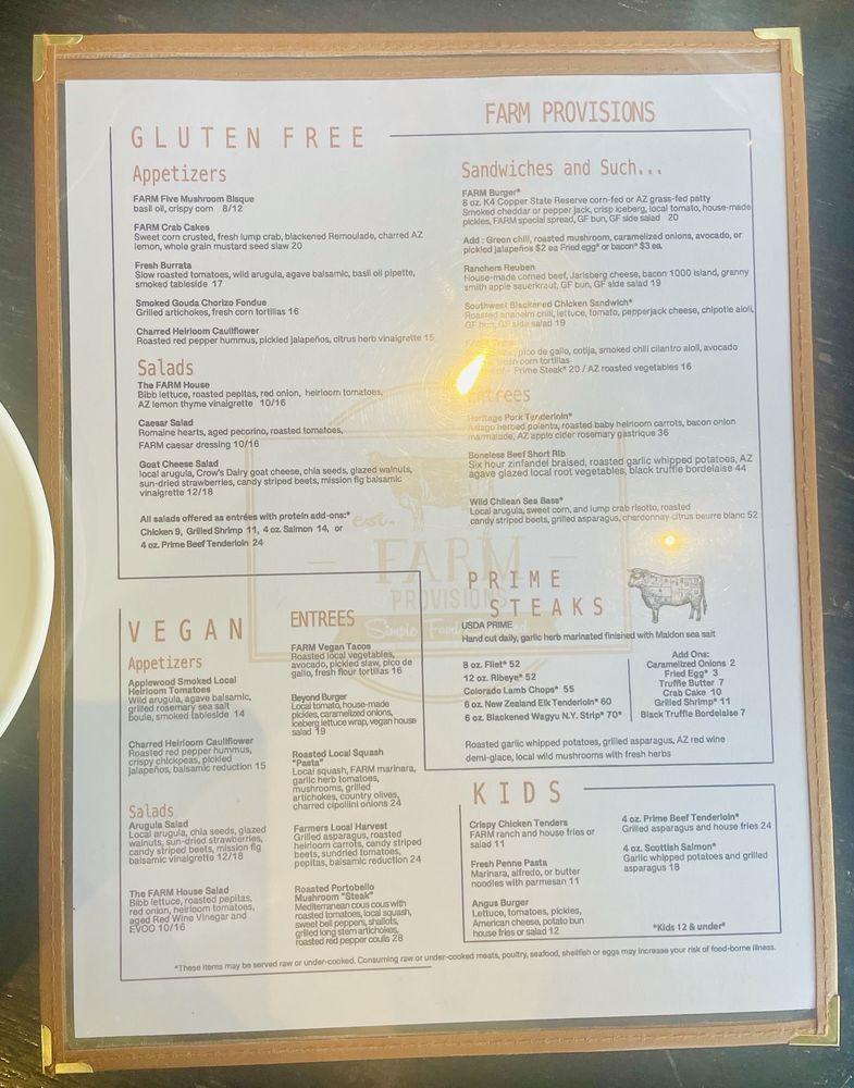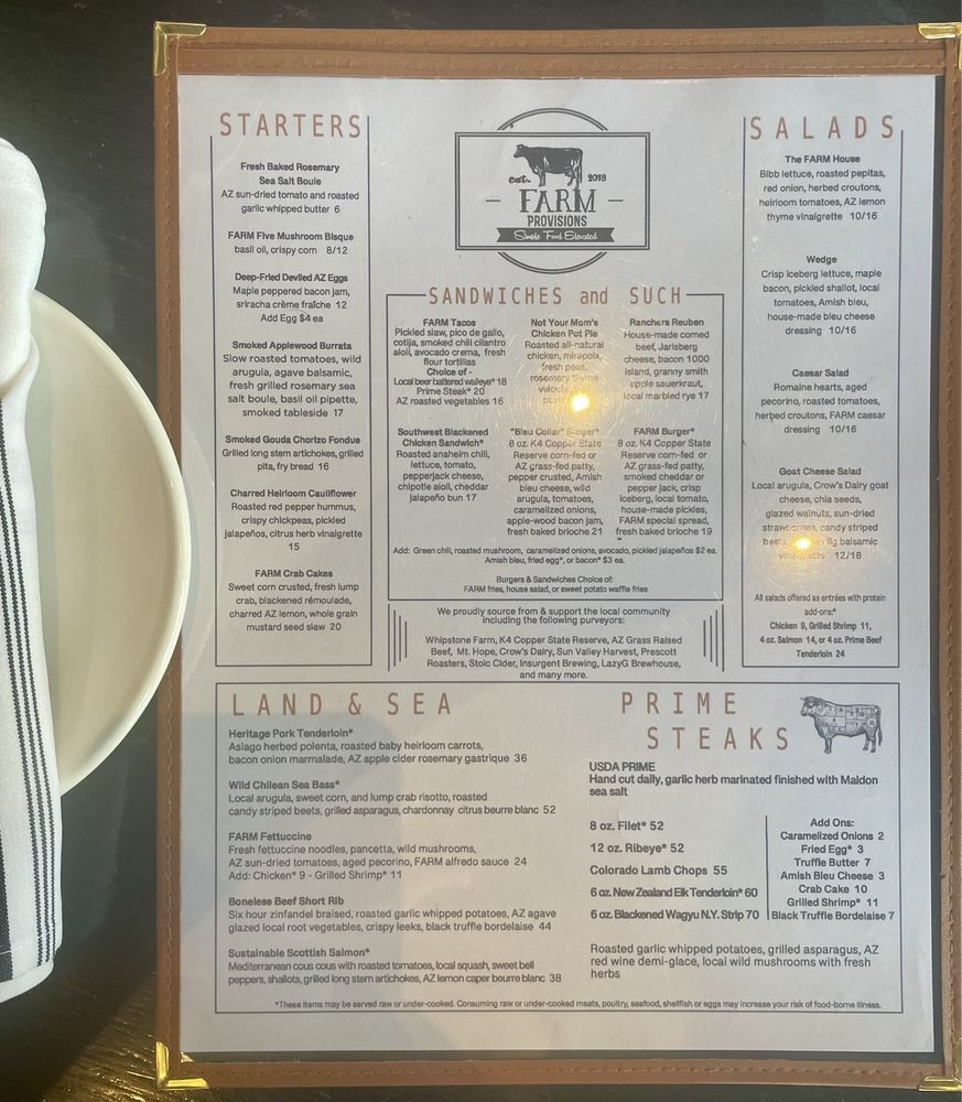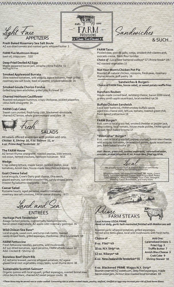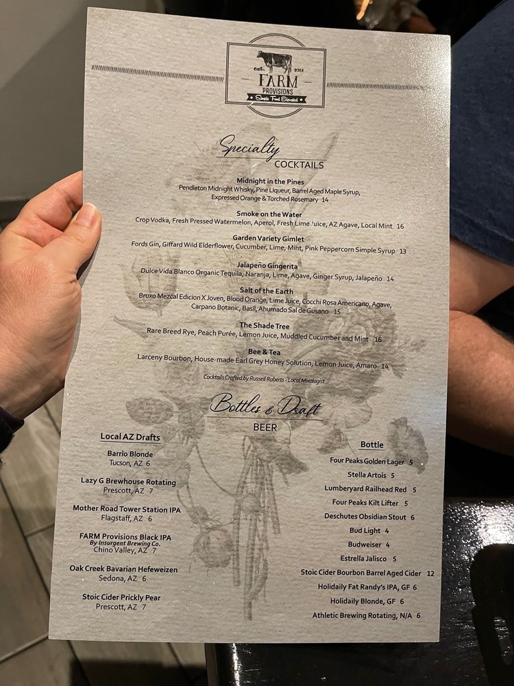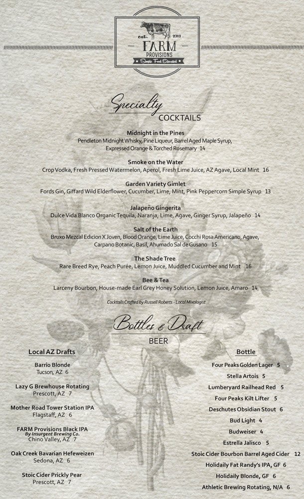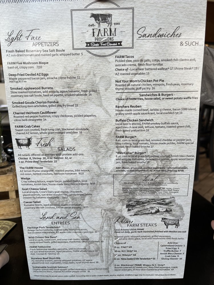 Farm Provisions is a trendy, women-owned restaurant in Prescott, AZ, offering a diverse menu with options ranging from fine dining to burgers and sandwiches. With a cozy and cute ambiance, it provides a welcoming atmosphere for customers. The menu features creative twists on traditional cocktails and flavorful dishes like Smoked Applewood Burrata, Short Rib, Beet and Goat Cheese Salad, Blue Cheese Burger, and Cauliflower and Burrata. The attentive and friendly service, along with the delicious food options, make Farm Provisions a must-visit spot for locals and visitors alike. With gluten-free options available and a focus on sustainability, including compostable containers and plastic-free packaging, Farm Provisions sets itself apart as a conscious dining destination. Don't forget to make a reservation in advance to secure a table at this highly recommended restaurant.